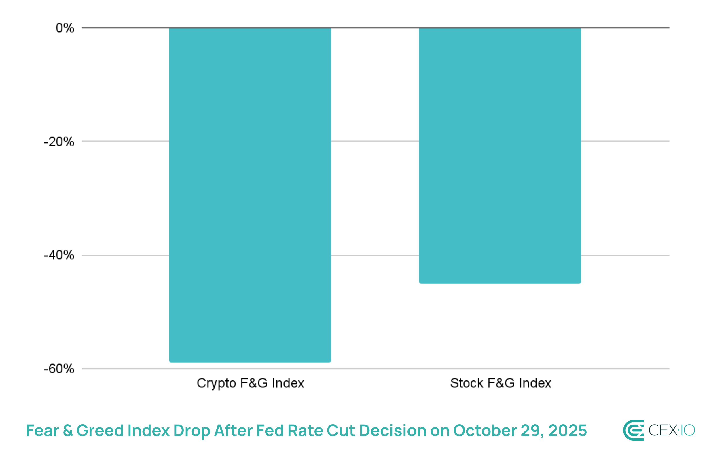 Shortly after that, another major drop occurred tied to Jerome Powell’s comments on October 29 that there might not be a December rate cut. This led to a 59% drop in Crypto F&G and 45% decrease in Stock F&G. The crypto market’s drop was also additionally fueled by an industry-local event such as a $128 million Balancer exploit on November 3.