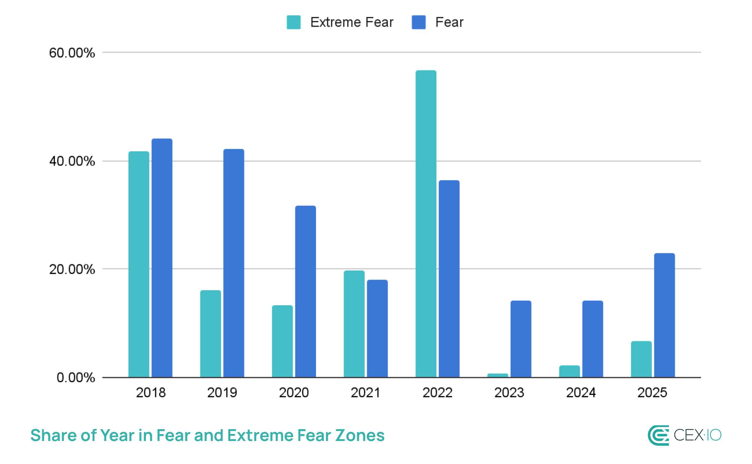 Over the past few years, the crypto market has spent less time in “fear” territory. Even with heightened macro uncertainty in 2025, the combined “fear” and “extreme fear” periods account for about 28% of the year so far — well below past peaks and even some bullish phases like 2021.