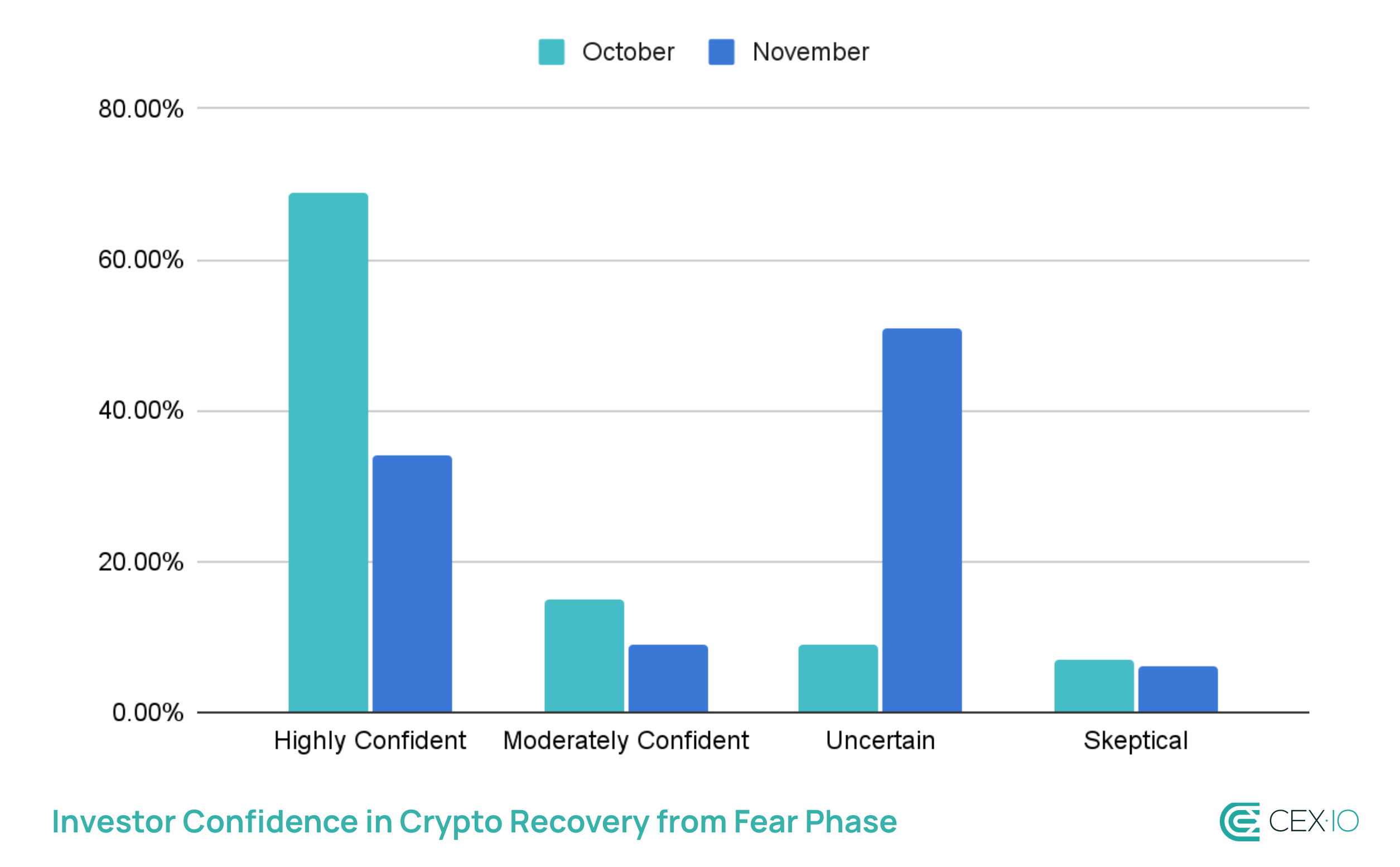 Investor confidence in a strong market recovery fell sharply, with the share of highly confident respondents dropping from 69% in October to just 34% in November.  Moreover, 70% of respondents claim that the crypto market might have already reached the cycle peak, and a deeper correction could unfold.